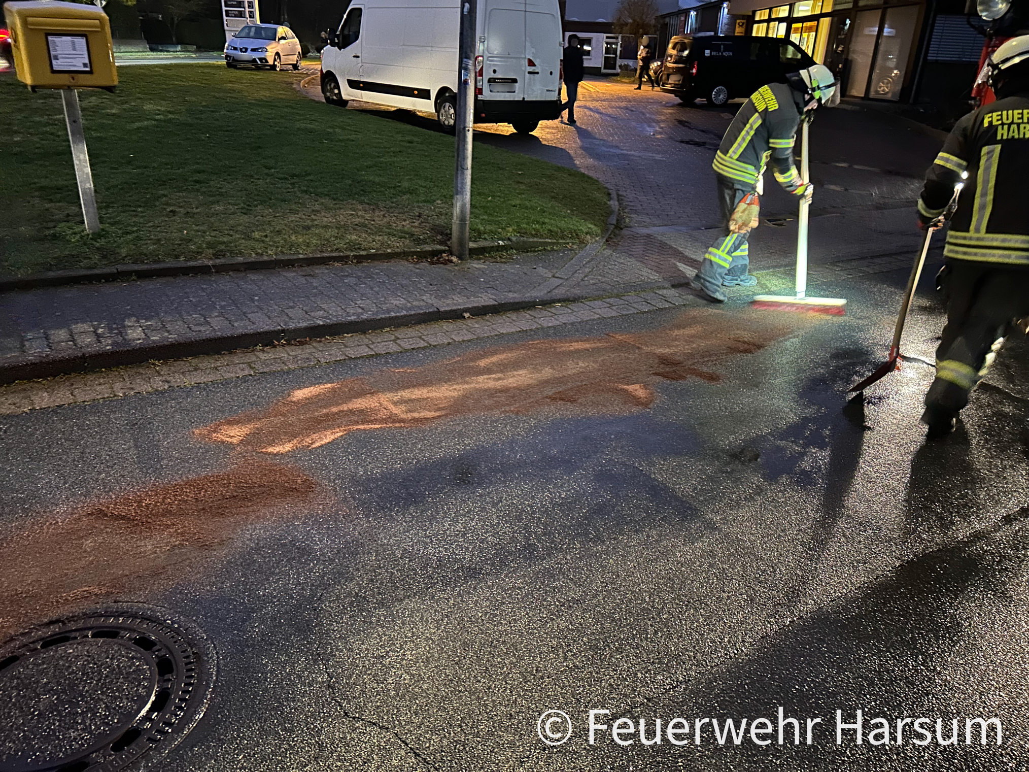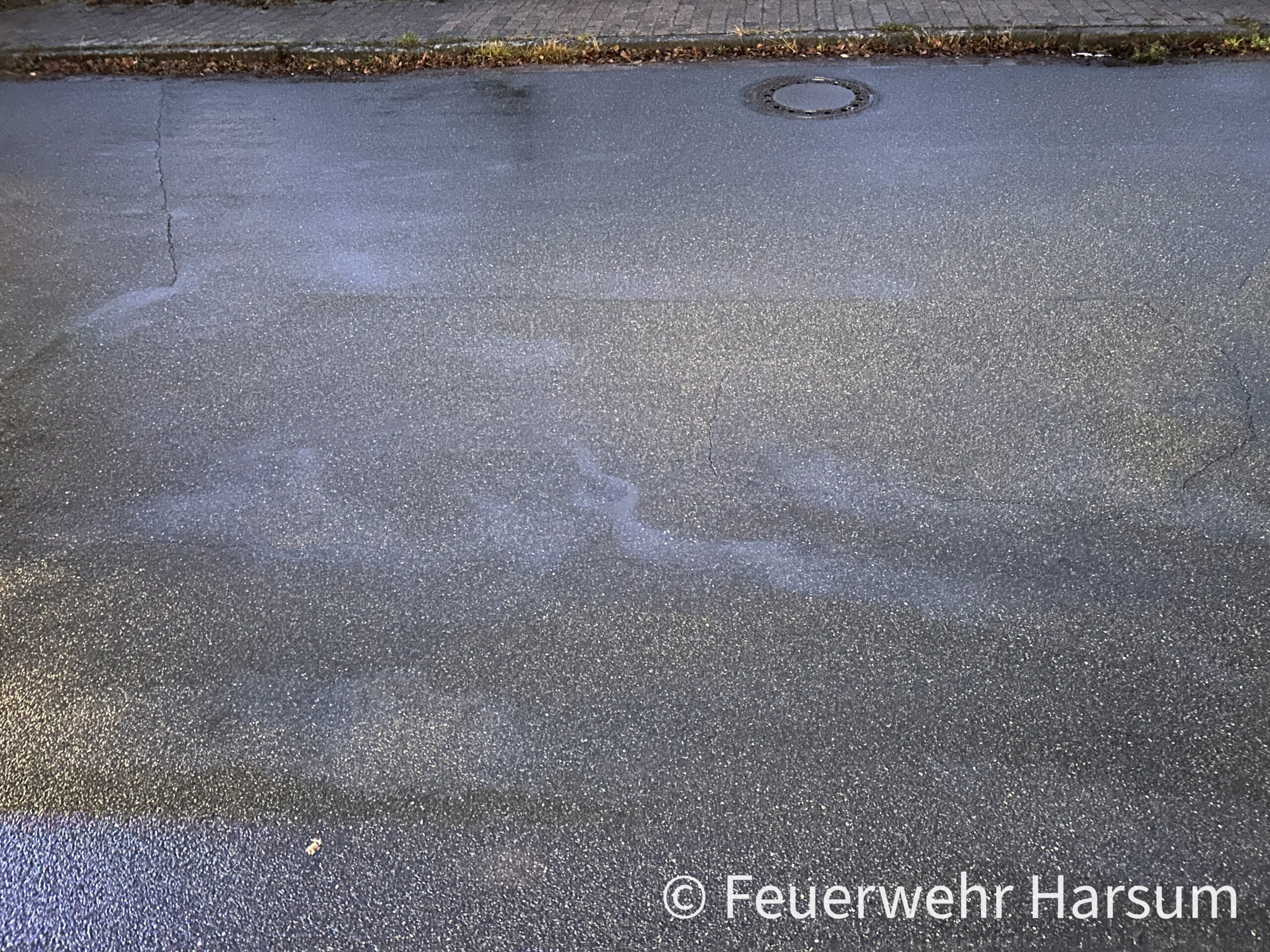 Vor Ort hatte ein Auto Dieselkraftstoff verloren. Wir streuten die Spur ab, sicherten die Gullieinläufe und nahmen anschließend das Bindemittel wieder auf. Nach ca. 30 Minuten war der Einsatz für uns beendet.