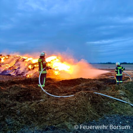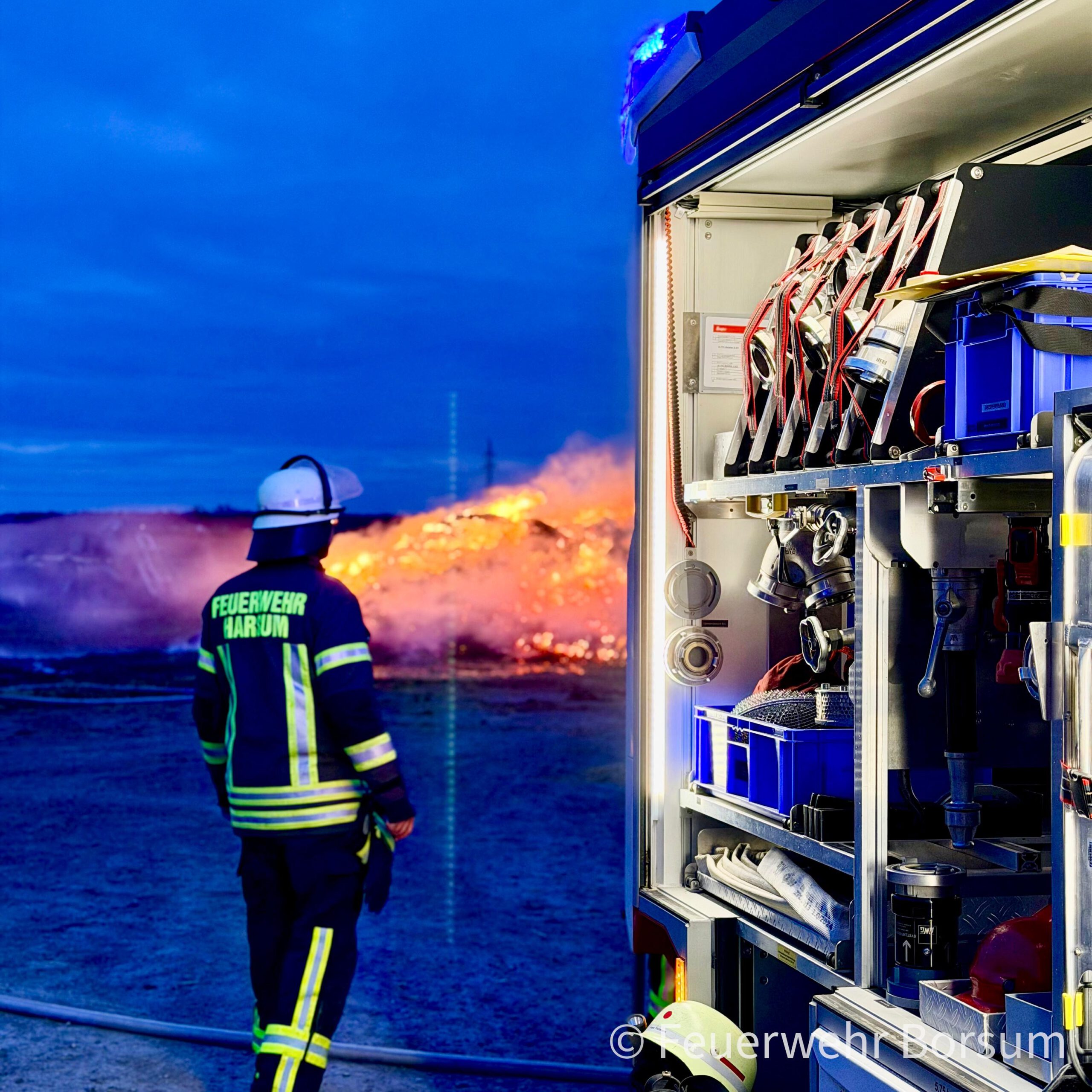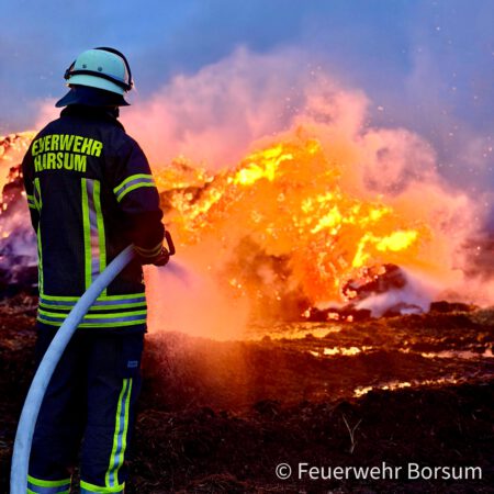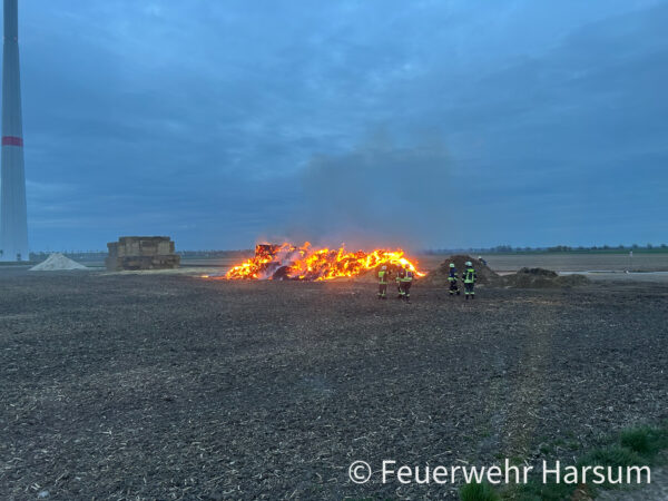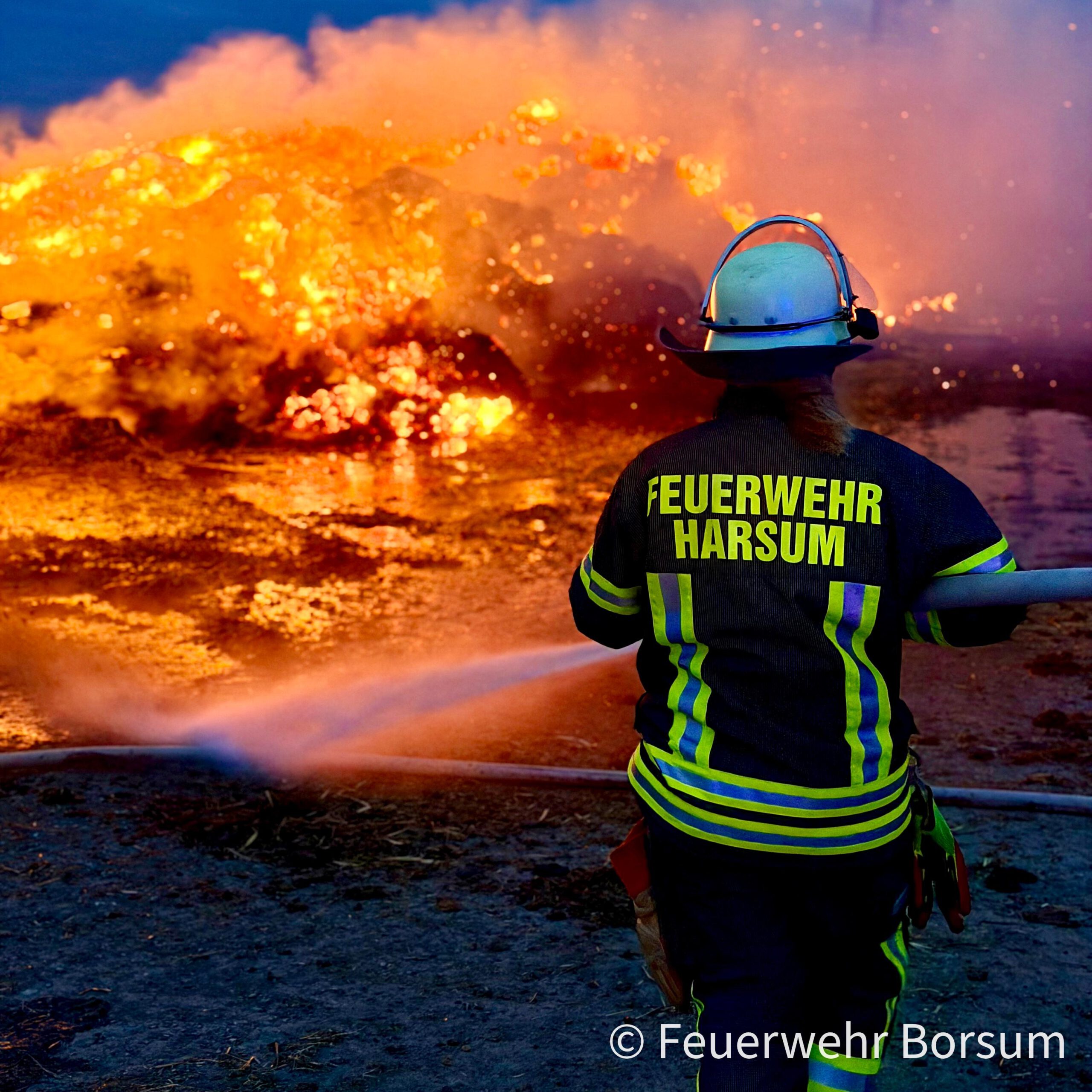 An der Einsatzstelle verhinderten wir, zusammen mit der Ortsfeuerwehr Hönnersum, die Ausbreitung auf weitere Strohballen. Dabei unterstützen uns auch Landwirte mit ihren Radladern.